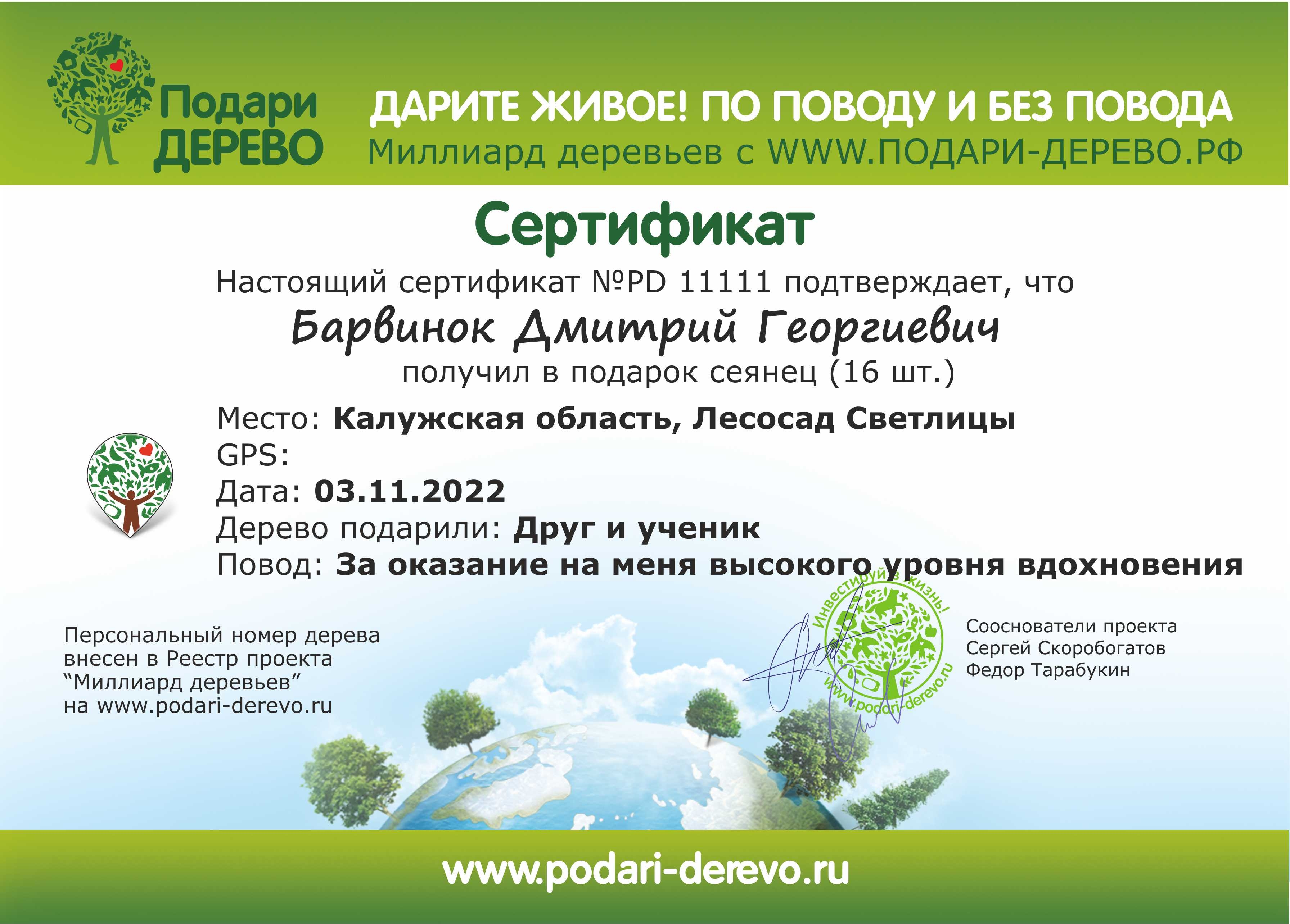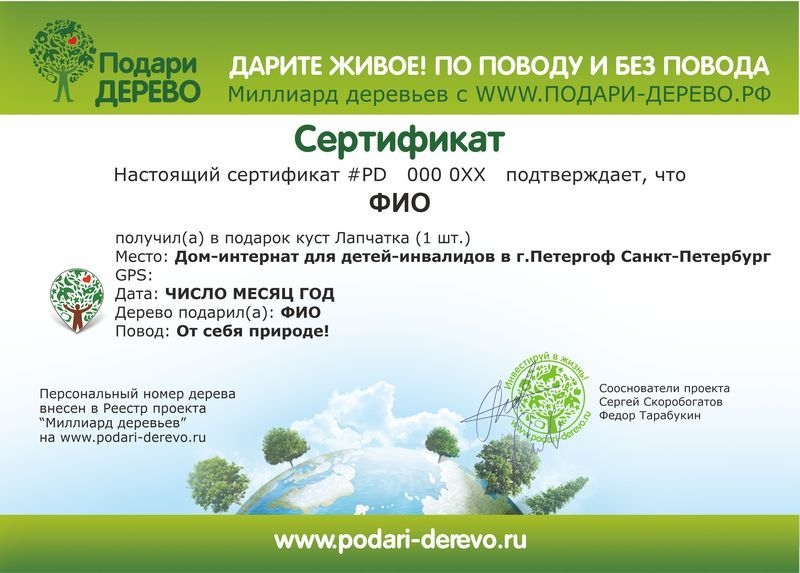 Вы приобретаете именной сертификат на посадку саженца.