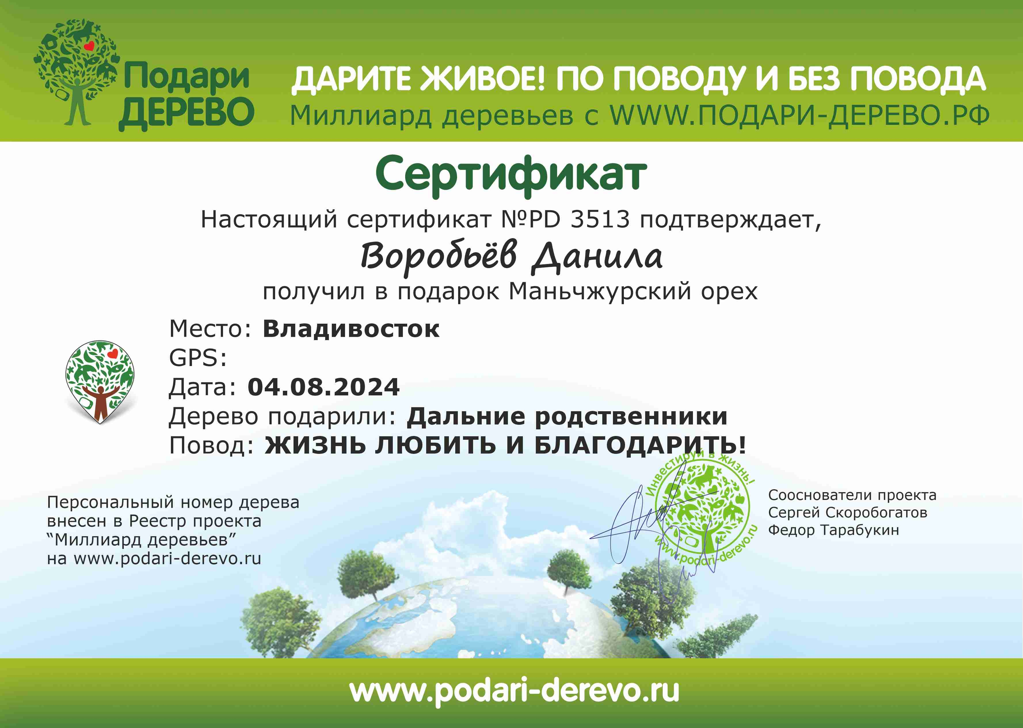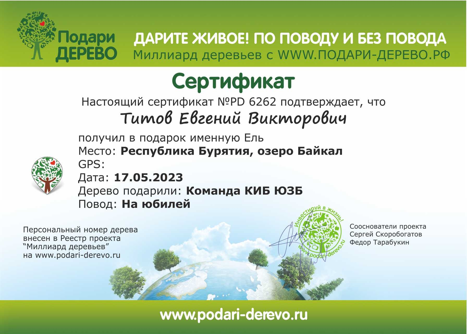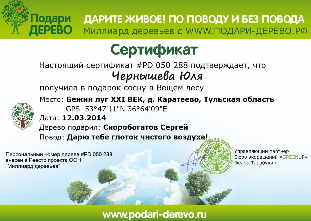 Вы получаете сертификат на посадку именного кедра.