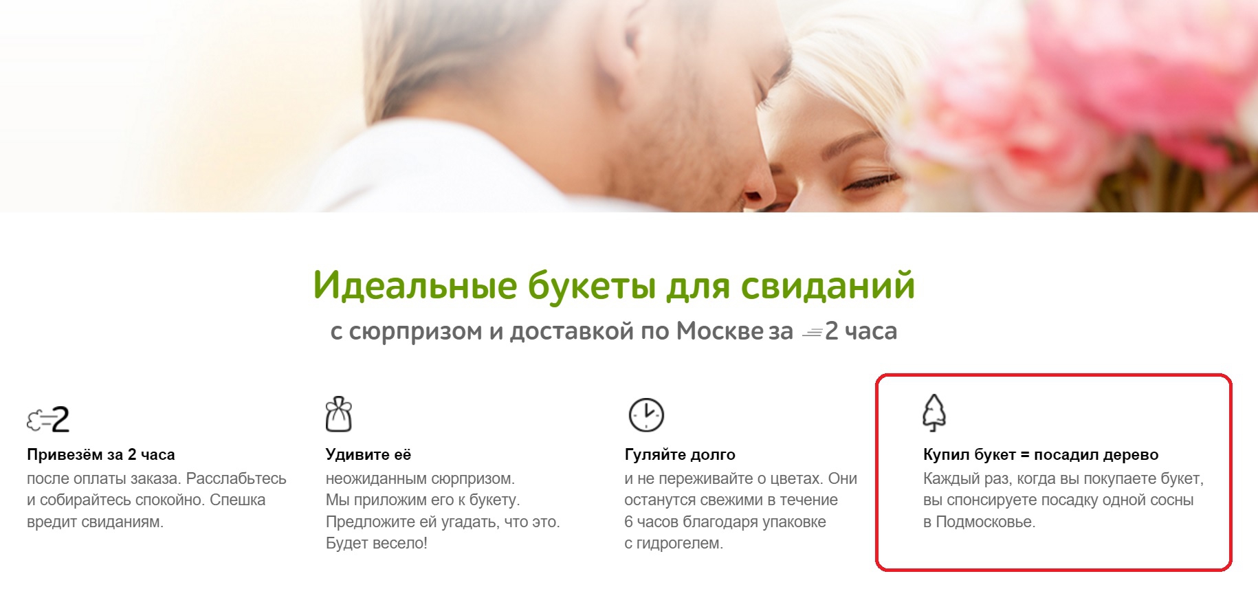 Кроме того, мы сделали удобный сайт, убрали всё лишнее из процесса заказа (можно заказать цветы за пару минут), прикладываем к букету открытку, сюрприз в пакетике, а за каждый букет высаживаем молодую сосну в Подмосковье.