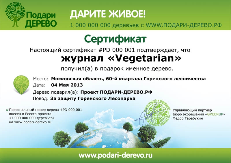 Cуть проекта в том, чтобы люди могли дарить друг другу живые именные деревья, посаженные удаленно, о чем мы присылаем красивый сертификат с точными GPS координатами и фотографией с места посадки.Для покупки именного дерева в Горенском лесу, переедите на форму оплаты (стоимость сертификата на именное дерево 350 руб.).