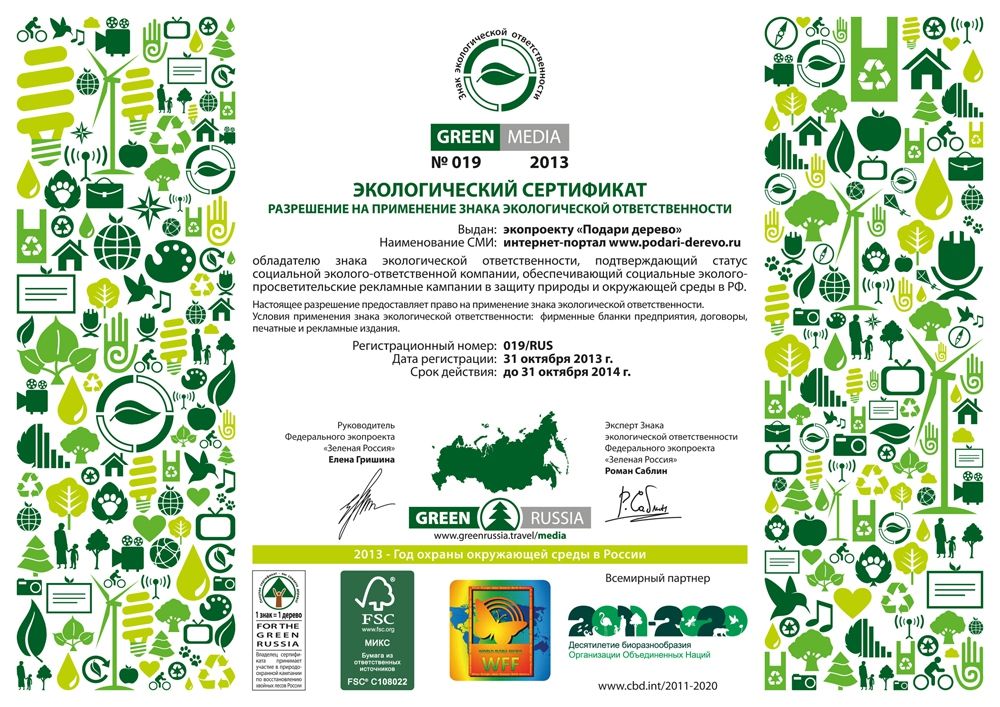 31 октября 2013 года экологический проект "Подари-дерево.рф" был отмечен знаком экологической ответственности GREEN MEDIA. Этот знак подстверждает статус проекта как социальной эколого-ответственной компании, ведущей свою деятельность в защиту природы и окружающей среды в РФ.
