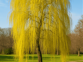 О дереве: Ива желтая плакучая — декоративный вариант ивы с опадающей формой и выразительными золотистыми побегами, принадлежащая семейству ивовых. Ствол у молодого дерева обычно прямой, затем ветви начинают ниспадать, образуя эффектную «занавеску» из побегов. Листва узкая, зелёная летом, осенью приобретает жёлтый оттенок. Особенной декоративностью дерево обладает зимой за счёт ярко-жёлтых или золотистых молодых побегов, которые выделяются на фоне однотонной зимней среды. Выдерживает холодный климат и подходит для средней полосы России, поэтому посадка во Владимирской области возможна при правильном уходе и выборе влажного, но дренированного места.