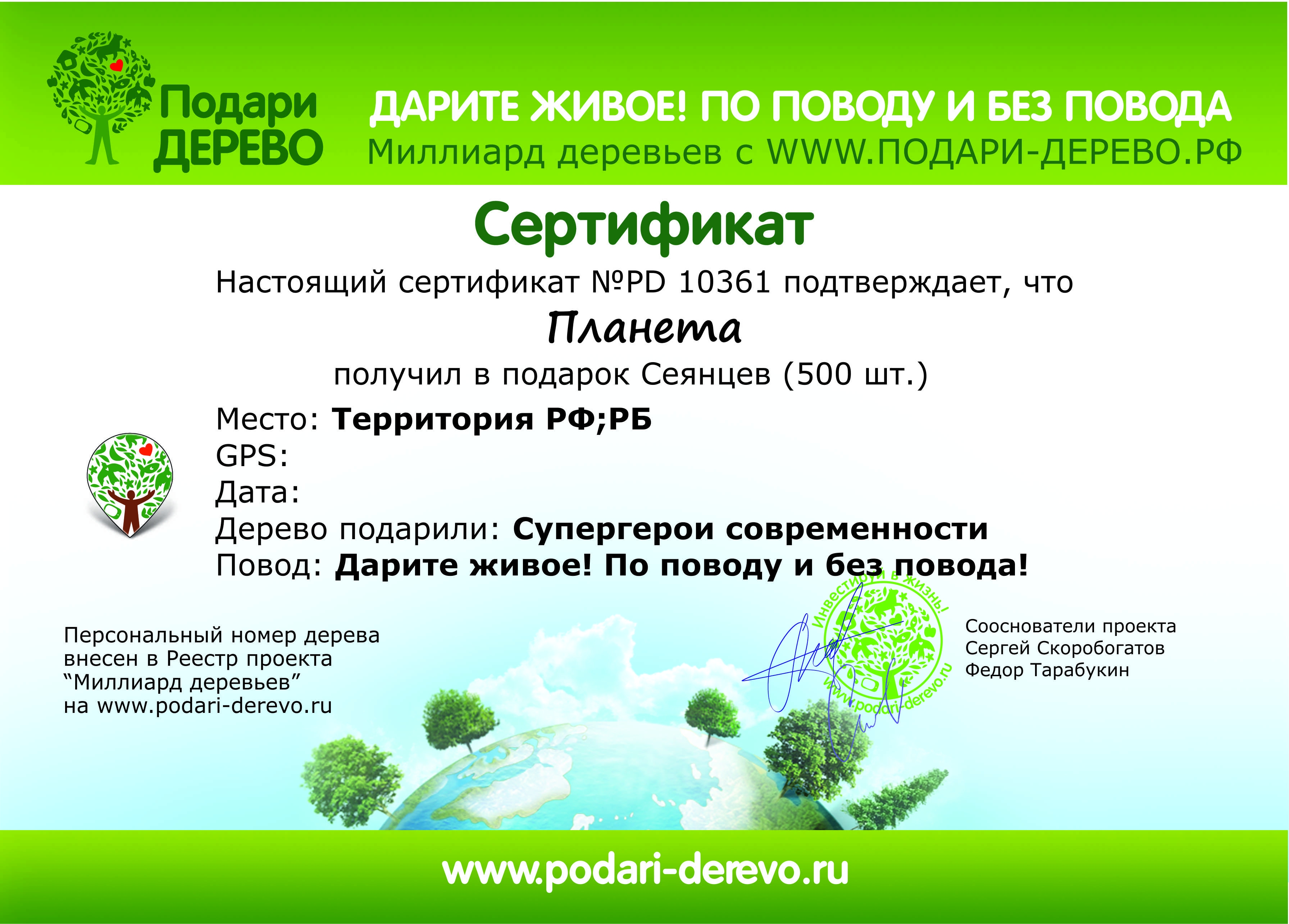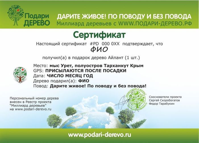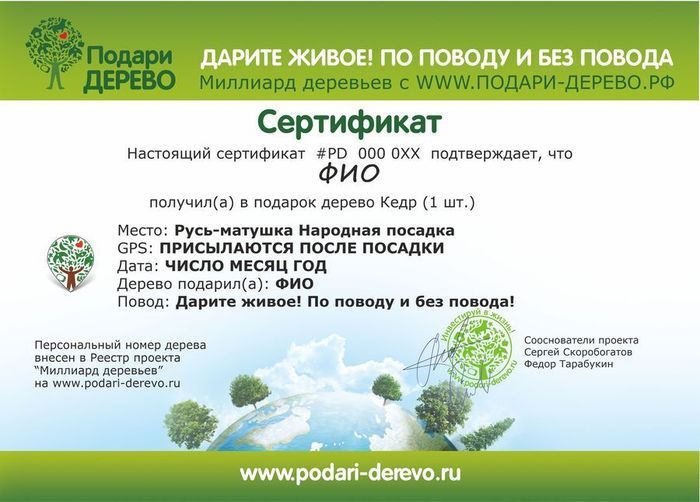 Будут посажены одно, двух летние сеянцы деревьев без табличек, с именным сертификатом на e-mail.